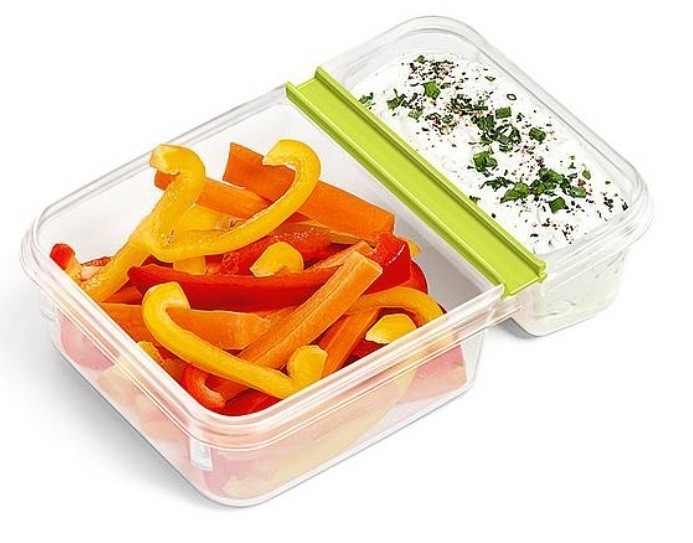 Description : boîte en plastique rectangulaire d'une contenance de 0,6L Tefal Masterseal To Go. Cette boîte possède un bord charnière" c'est à dire un bord pliable. Grâce à cette boîte, vous pouvez transporter d'un côté du yaourt ou fromage blanc et de l'autre du muesli ou des fruits frais et en un tour de main, mélanger les deux en faisant basculer un côté sur l'autre. Cette boîte est idéale aussi pour des bâtonnets de légumes accompagnés d'une sauce aux fines herbes.