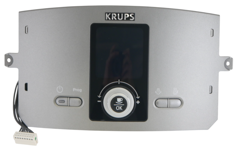 Description : Cadran avec carte électronique de commande de remplacement pour machine à café Krups Espresseria. Ce cadran frontal comprend la carte électronique de commande avec écran et les boutons de contrôle présents sur le devant de la cafetière.