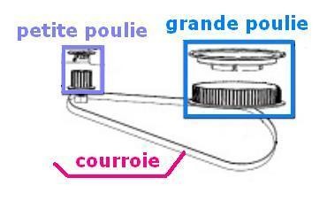 Description : La grande poulie va être entraînée par la courroie, elle-même mise en mouvement par la petite poulie.