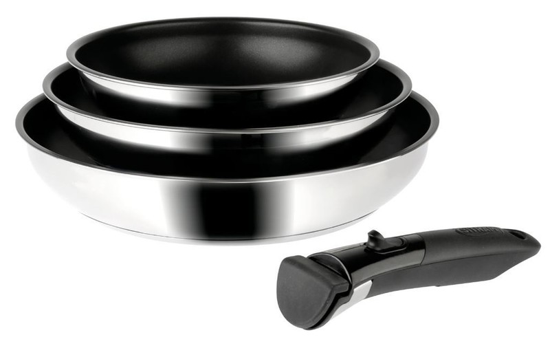 Description : Lot de 3 poêles inox avec revêtement antiadhésif et poignée amovible Arpège. Ce jeu de poêles avec extérieur inox et intérieur antiadhésif est idéal pour la cuisson de vos aliments. La poignée amovible permet une utilisation sur les plaques de cuisson (dont induction) ainsi que dans le four (température maximum de 180°C).